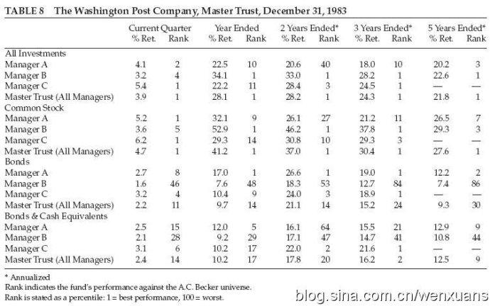 正如你在投资记录中所看到的那样,从他们更换基金经理之后,其整体投资业绩在所有基金中一直名列前茅。华盛顿邮报公司要求基金经理人至少保持25%的资金投资于债券,而债券未必是基金经理人的投资选择。因此,我在表中也将其债券投资业绩包括在内,而这些数据表明他们其实并没有什么特别的债券专业技巧,他们也从未这样吹嘘过自己,虽然有25%的资金投资于他们所不擅长的债券领域,从而拖累了他们的投资业绩,但其基金管理业绩水平仍然名列前一百名之内。华盛顿邮报公司退休基金的投资尽管并没有经过一个很长的市场低迷时期的考验,但仍然足以证明三位基金经理的许多投资决策并非后见之明。