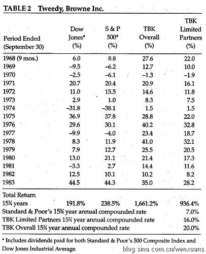 1986年,汤姆-科拿普与同样是格雷厄姆信徒的艾德-安德森(Ed Anderson)以及其他几位有共同投资理念的人合伙组建了特维帝-布朗合伙公司(Tweedy, Browne Partners),他们的投资业绩见表2。该公司取得以上投资记录的方式是进行高度分散化的投资组合,他们偶尔也会并购企业取得控制权,但其被动式投资业绩与控制权投资的业绩基本相同。