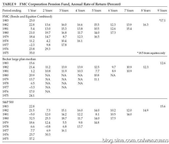 投资业绩属于FMC公司退休基金,我本人没有管理过这家基金的一分钱,但我的确在1974年影响了他们的决策,说服他们选择以价值为导向的基金经理。在此之前,他们采取与其他大型企业相同的方式来选择基金经理。在他们转向价值投资策略之后,其投资业绩目前在贝克退休基金调查报告(the Becker survey of pension funds)中超越其他同等规模基金而名列第一。1983年时,该基金共有8位任职1年以上的基金经理,其中7位累积投资业绩超过标准普尔指数。在此期间,FMC基金的实际业绩表现与基金平均业绩表现的净回报差额是2.43亿美元,FMC将此归功于他们与众不同的基金经理选择倾向,这些基金经理未必会是我个人中意的选择,但他们都具有一个共同的特点,即基于价值来选择股票。